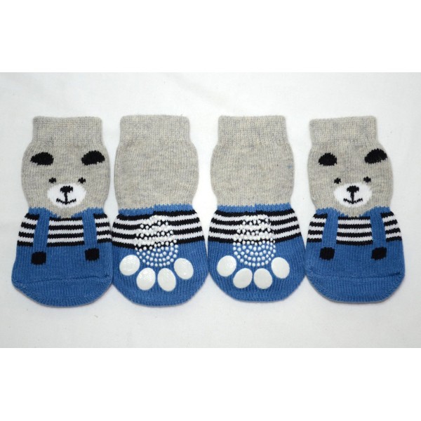 We heart these pet socks! Toasty paws = a warm heart! These 100% cotton non slip socks are perfect for dogs, cats, and puppies.  These socks are soft and comfy with stretch cotton and skid free padded bottoms. You will receive a package of 4. Material: Cotton, spandex, nylon, and rubber.