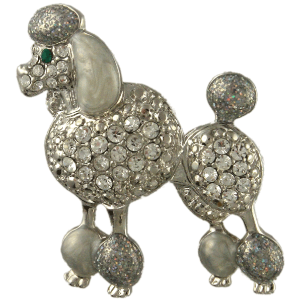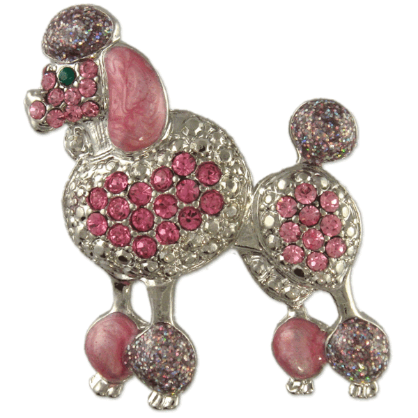 Choose Pink or White. There is nothing but sparkle and detail on this sweet Poodle brooch. Sure to bring a smile to any poodle lover's face! 1" long x 1 1/2 " tall.