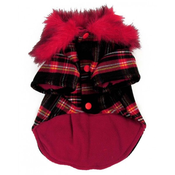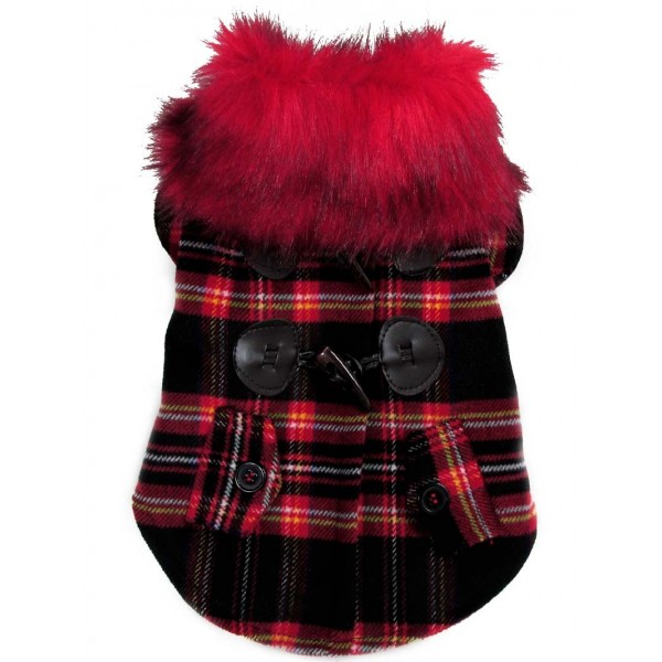 This gorgeous coat is well made and fashion forward.Your pet will turn heads in this plaid coat with faux fur collar.