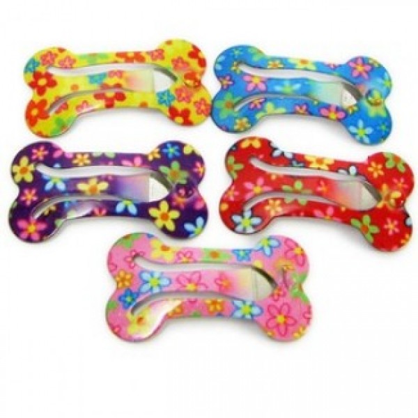 Our best selling bone shaped snap hair clips are the perfect solution for keeping long hair out of your pup's eyes! These are THIN and VERY LIGHTWEIGHT snap hair clips that are great for holding down loose hairs.   The coloring is NOT an added piece, but rather painted onto the clip.